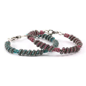 Coil, bend, wind and boss that wire into amazing bangle bracelets. Craft two of these artful whirlwinds of light and texture using Lisa Niven Kelly's sculptural wire techniques. Discuss antiquing and design options then finish with a spiral hook and eye clasp.Buy the PDF Tutorial »