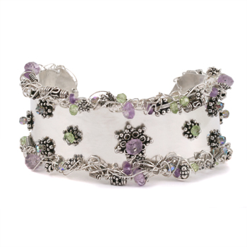 In this fun, freeform, and expressive class, we will start with a piece of sterling sheet metal and embellish the outer edge with wirework and beads. A few beads will also decorate the middle of the cuff before shaping. No sawing, soldering, or filing, just simple pliers, sheers, and a hole punch are used. You will also learn to antique and polish your piece.Sheet Metal Cuff