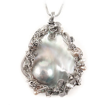 Lisa will teach you how to form a wire cage which entraps a Mabe Pearl or Cabochon with no binding wires in back. We will then add some freeform wirework and Bali Silver Beads to really jazz up this bezel.