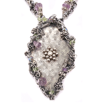 Here is a project for those Wireworkers who like to work Sculpturally with very few "rules". Begin by cutting out your own personal shape from Sheet Metal, and then stamp it with various decorative stamps to add texture. Embellish the rim and center with silver beads, silver wire and semi-precious beads.